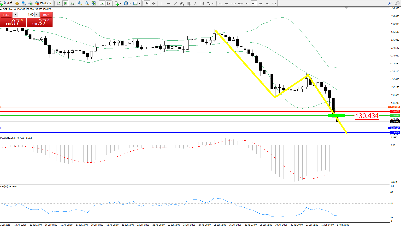 交易策略:130.434下方看跌,目标129.684、129.401