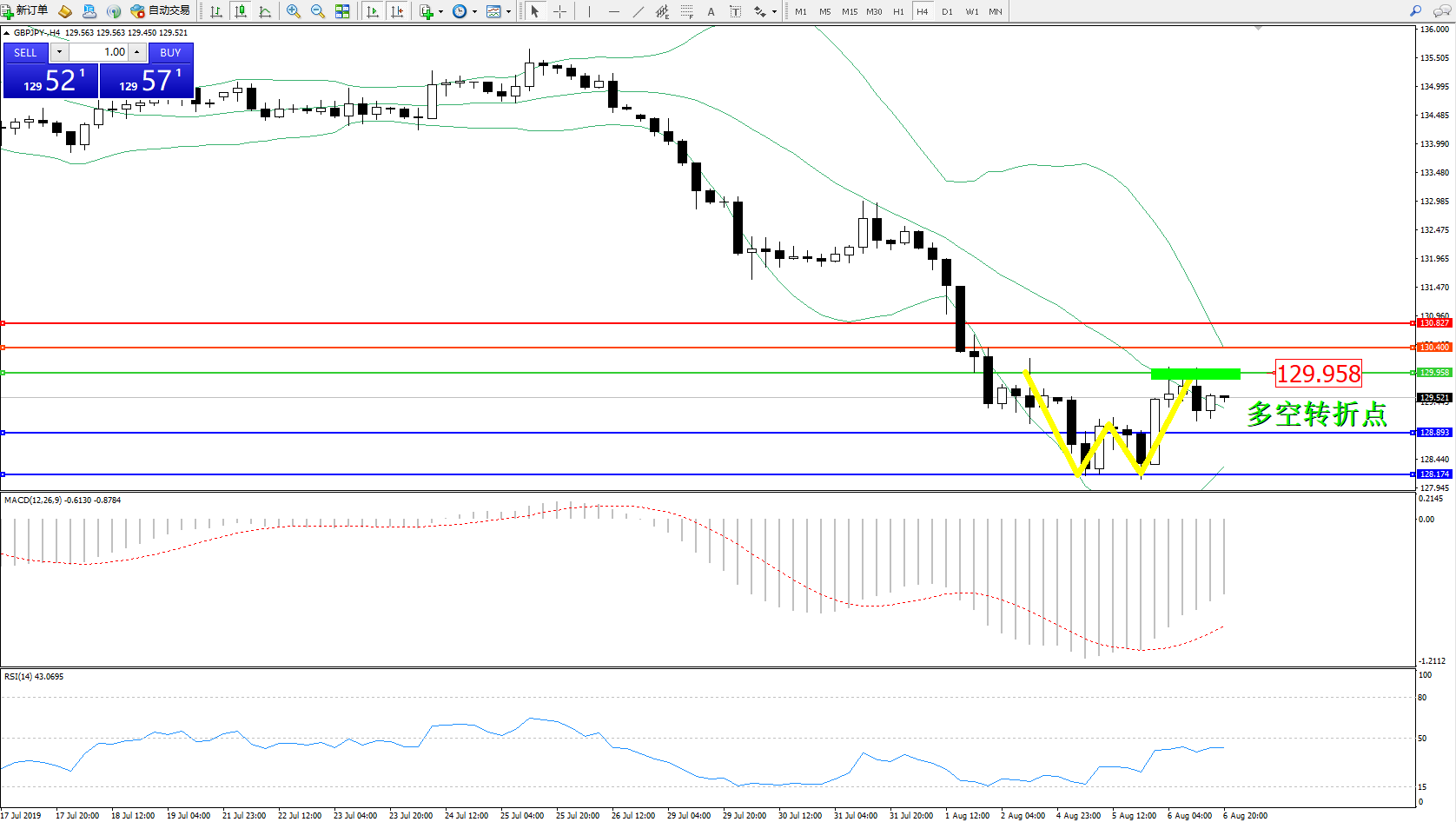交易策略:129.958下方看跌,目标128.893、128.174