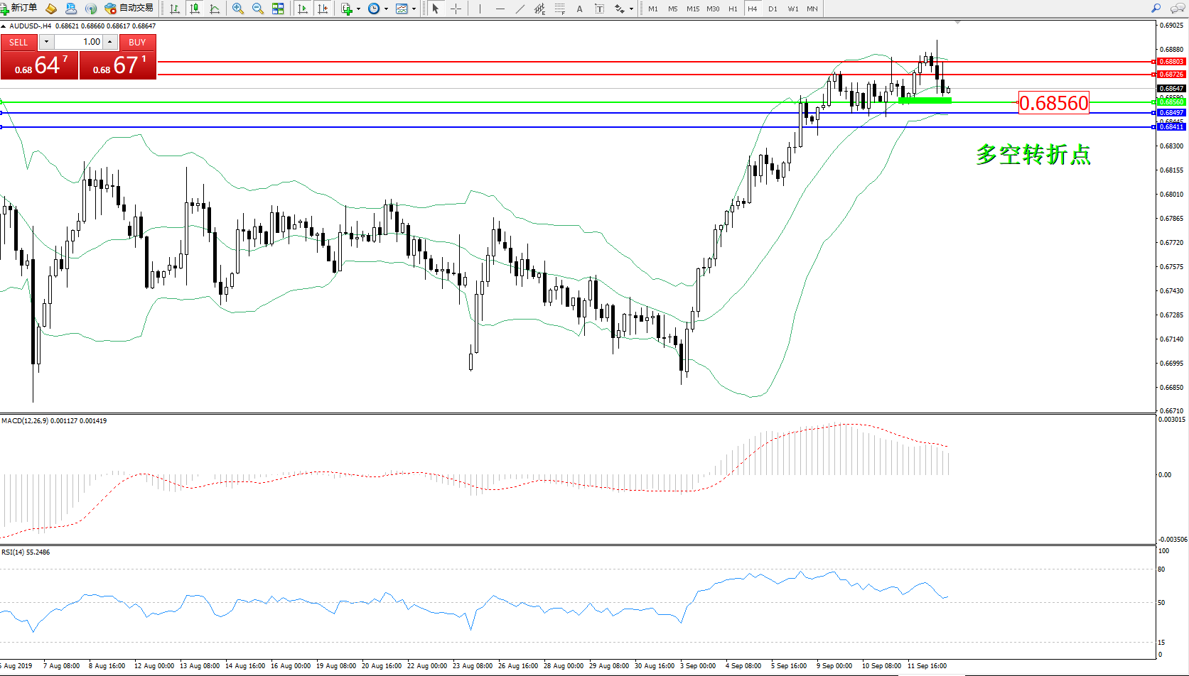 交易策略:0.68560上方看涨,目标0.68726、0.68803