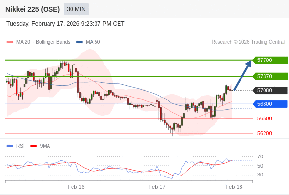在 56800 之上,看涨,目标价位为 57370 ,然后为 57700 。