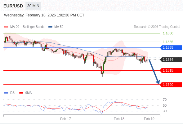 交易策略: 在 1.1855 之下,看跌,目标价位为 1.1815 ,然后为 1.1790 。