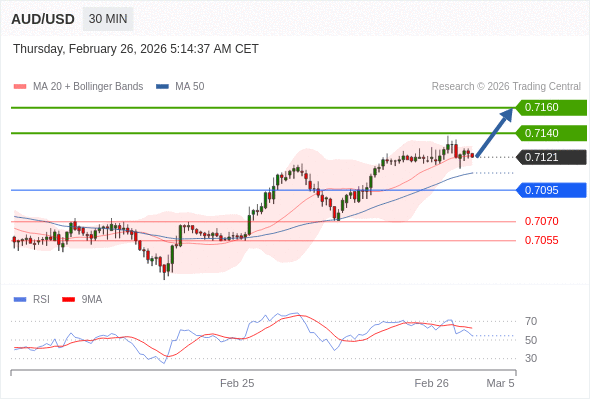 在 0.7095 之上,看涨,目标价位为 0.7140 ,然后为 0.7160 。