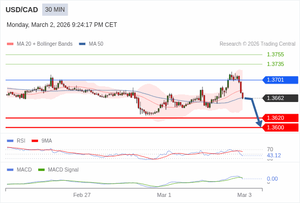 美元/加元 当日内 : 看跌,当 1.3701 为阻力位。