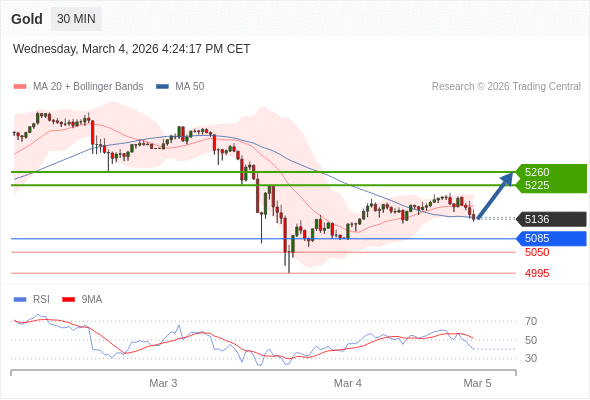 交易策略: 在 5085 之上,看涨,目标价位为 5225 ,然后为 5260 。