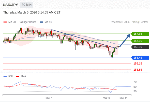 在 156.45 之上,看涨,目标价位为 157.30 ,然后为 157.65 。