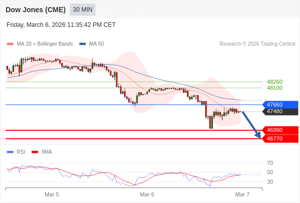 美国道琼斯指数期货 (H6) 当日内: 短期关键阻力位在47660。