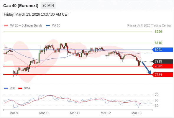 法国CAC指数期货 (Euronext) (H6) 当日内: 存在压力。