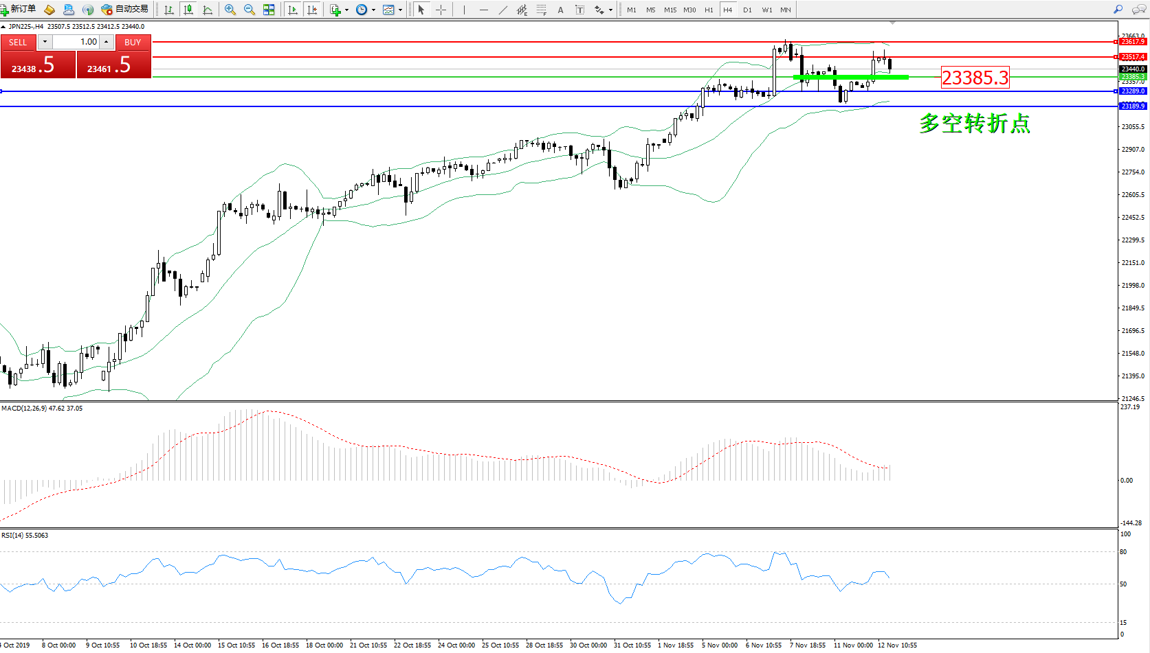 日经225指数11月12日(周二)收盘上涨189.66点,涨幅0.81%,报23521.50点。日经指数收涨0.8%至23520点,传言有人工智能买盘,不过日经指数仍在上周五所及年内高点23591.09下方;日本10年期国债收益率涨至4月26日以来最高。日本首相安倍晋三:想要通过追加额外的预算来确保经济复苏。