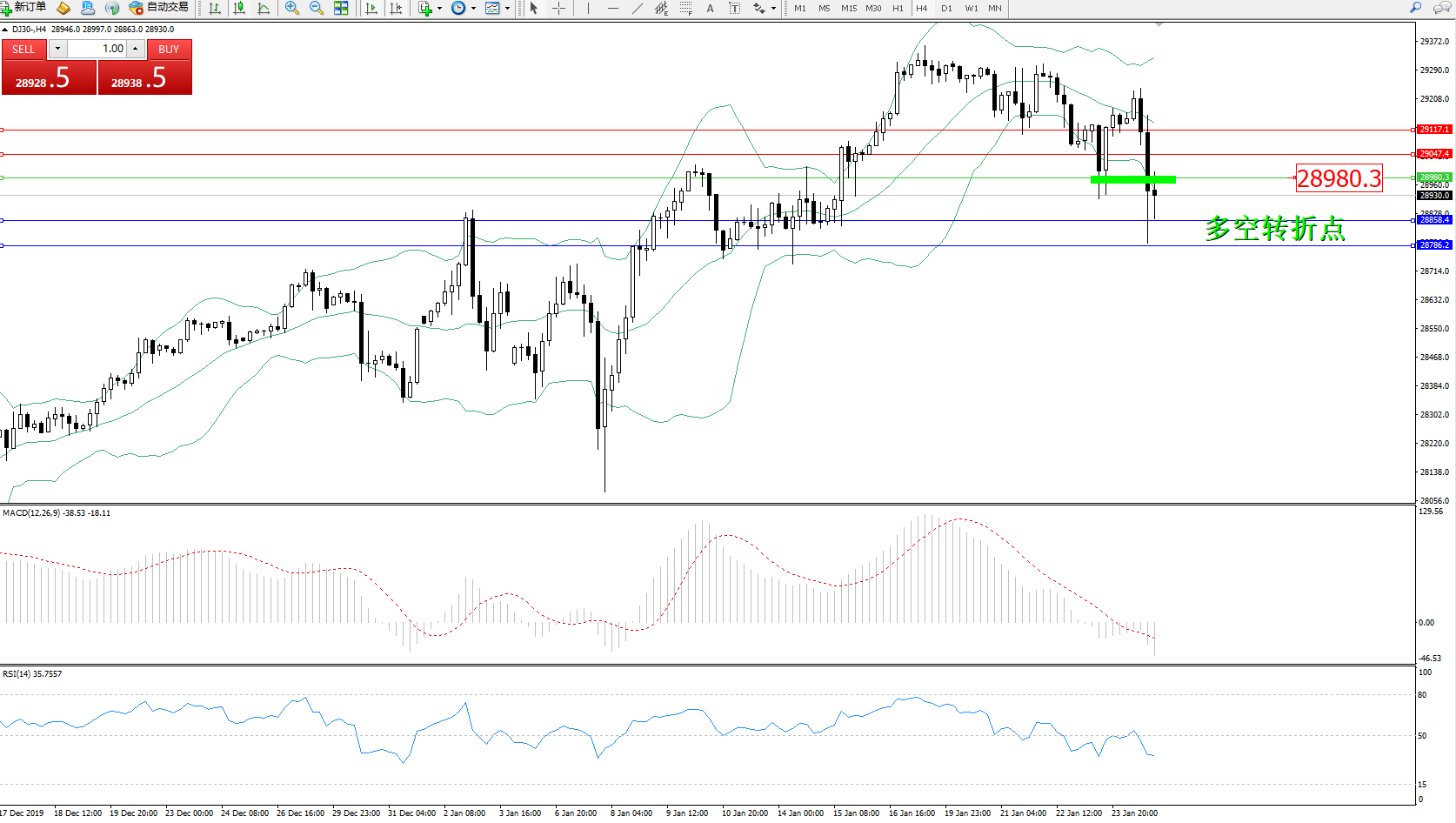 道琼斯指数DJ30—— 4小时K线图显示: