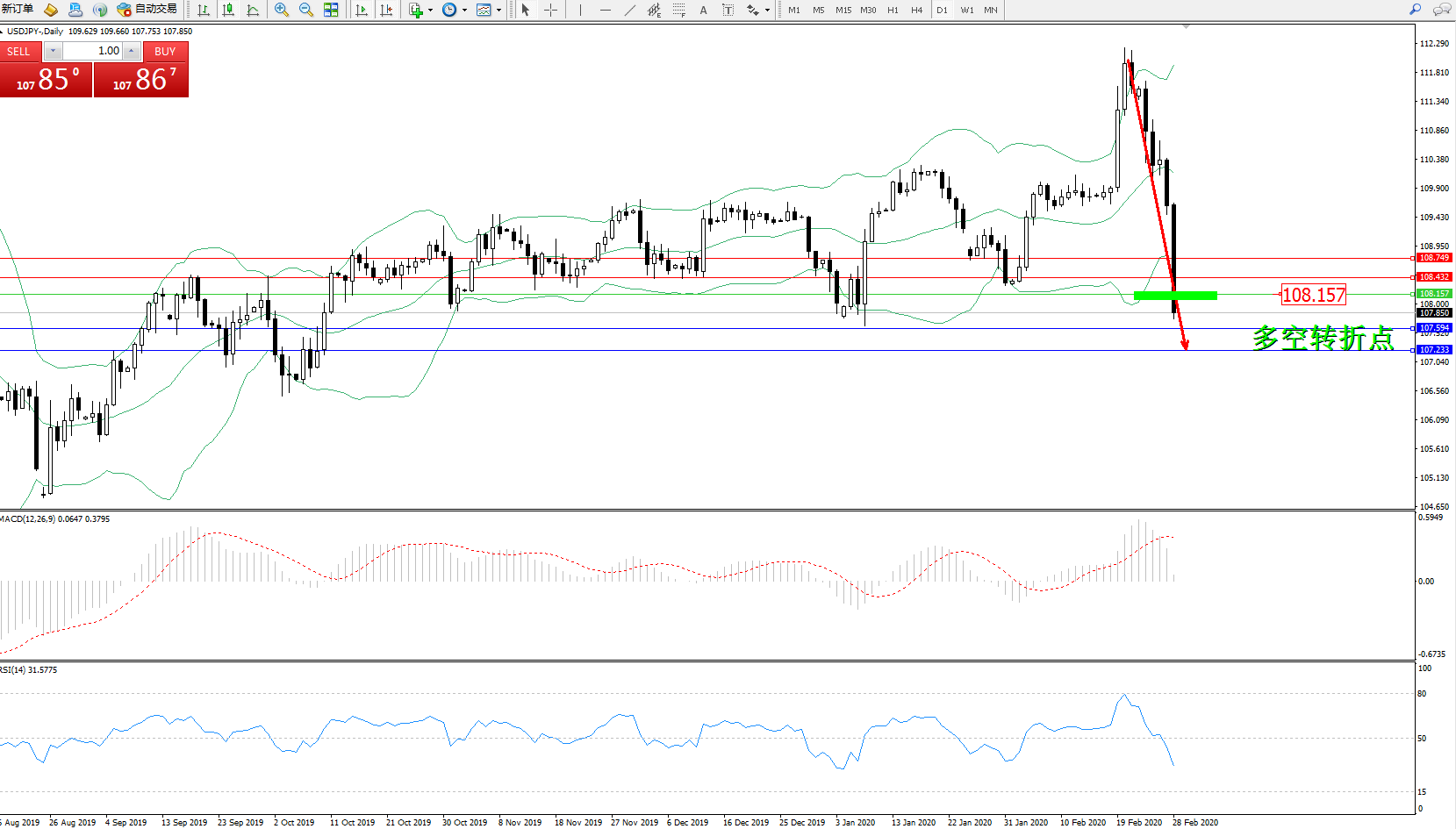 交易策略:108.157下方看跌,目标107.594、107.233