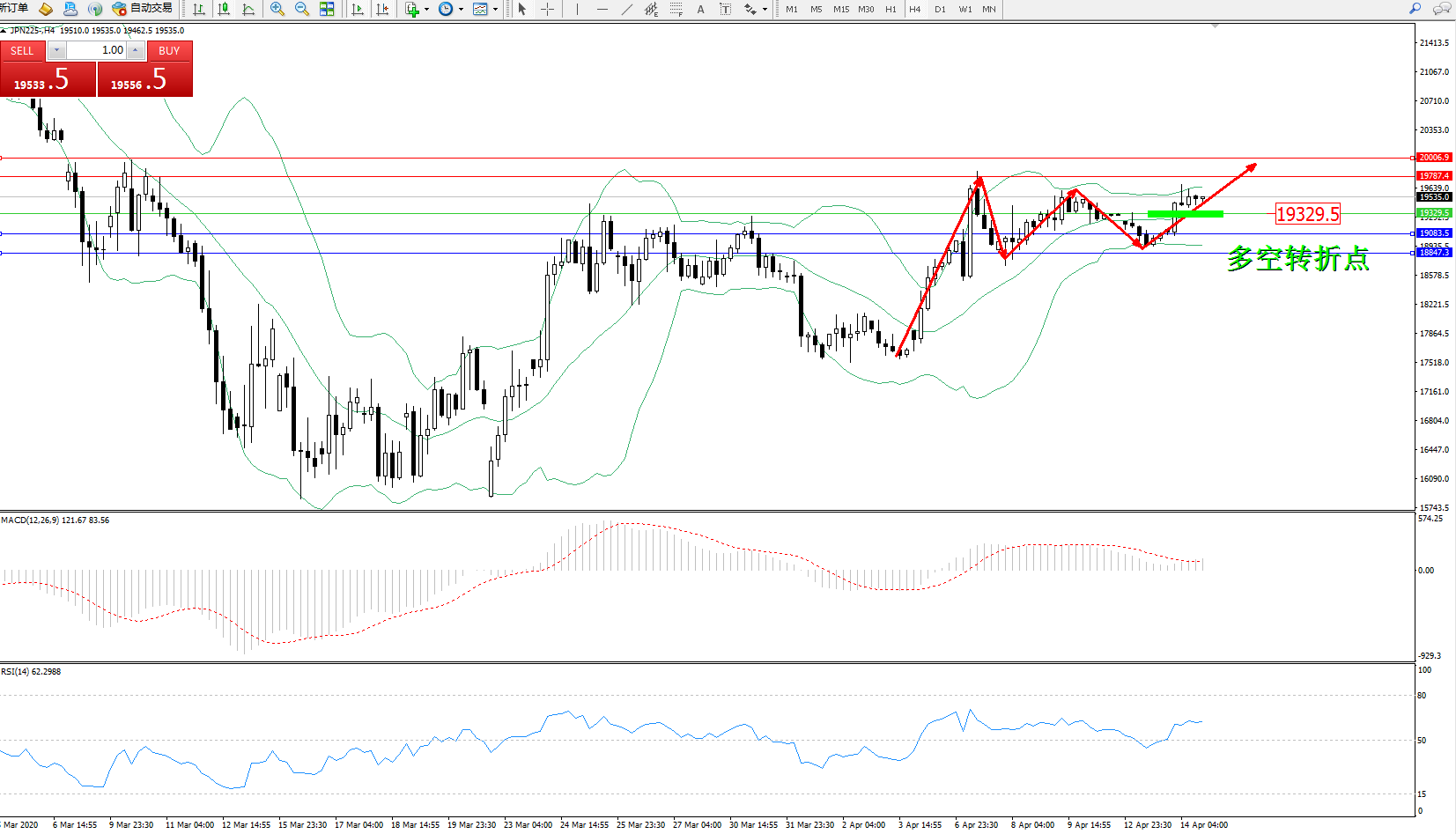 日经225指数414日(周二)收盘上涨586.60点,涨幅3.08%,报19630.00点。随着疫情令经济陷入衰退,促使各地央行推出庞大的刺激计划,市场担心新冠病毒大流行将对全球经济造成毁灭性影响,冲击企业收益,同时增加对避险资产的需求。在本月的利率政策评估中,日本央行将讨论采取进一步措施来缓解企业的融资压力。日本提供0.5万亿日元的国债以提供流动性,在最初阶段的讨论中,日本央行可能考虑的方案包括增加购买商业票据和公司债券,扩大作为抵押品的资产的可接受范围。日本经济再生大臣西村康稔:计划在5月内向受到新冠疫情影响而有需要的人发放现金。