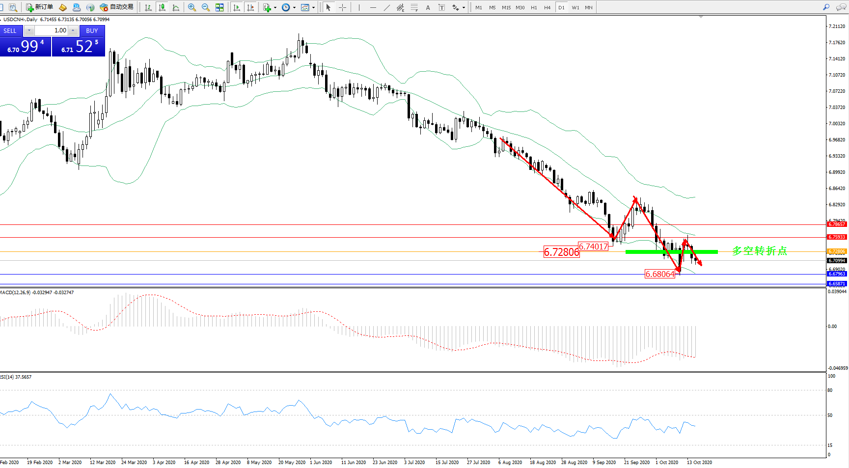 交易策略:6.72806下方看跌,目标6.67963、6.65871