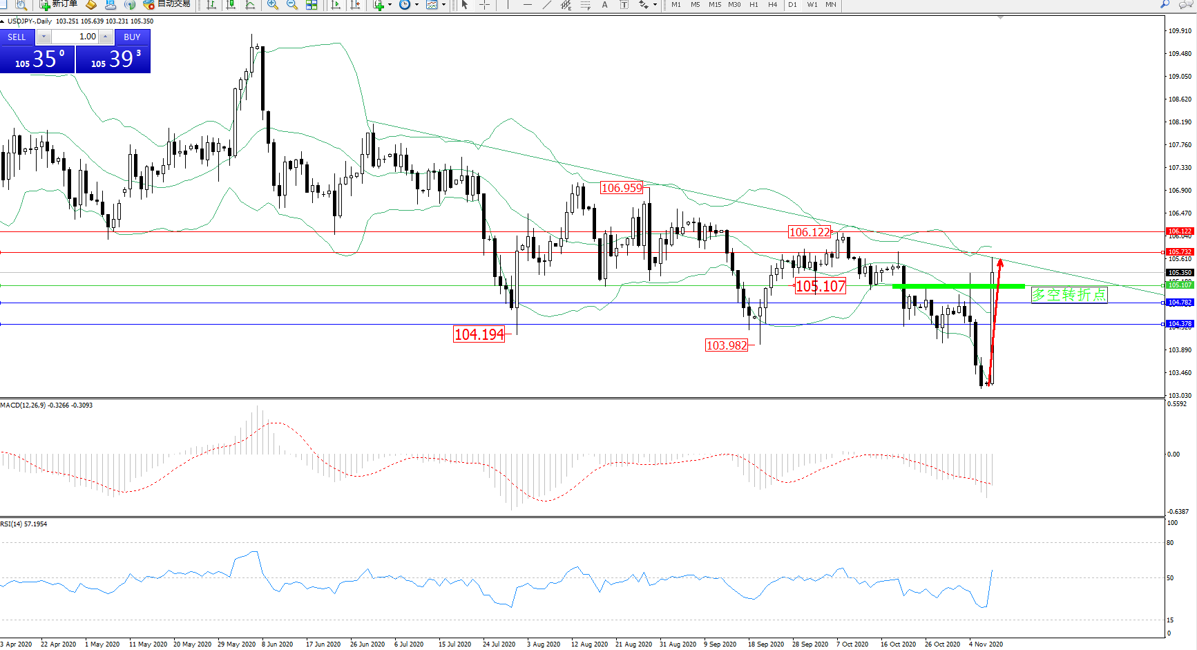 交易策略:105.107上方看涨,目标105.732、106.122