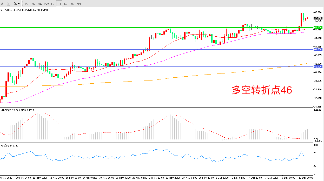 周四(12月10日),美国财长努钦和众议院议长佩洛西均表示,在达成新冠救助协议方面已取得进展,市场风险情绪回归,美国WTI原油大涨近3%,收报47.03美元/桶。目前市场持续受到新冠疫苗即将大规模推出的利好消息提振,以及昨日伊拉克北部两处油井遇袭事件的影响,多头情绪较为乐观。