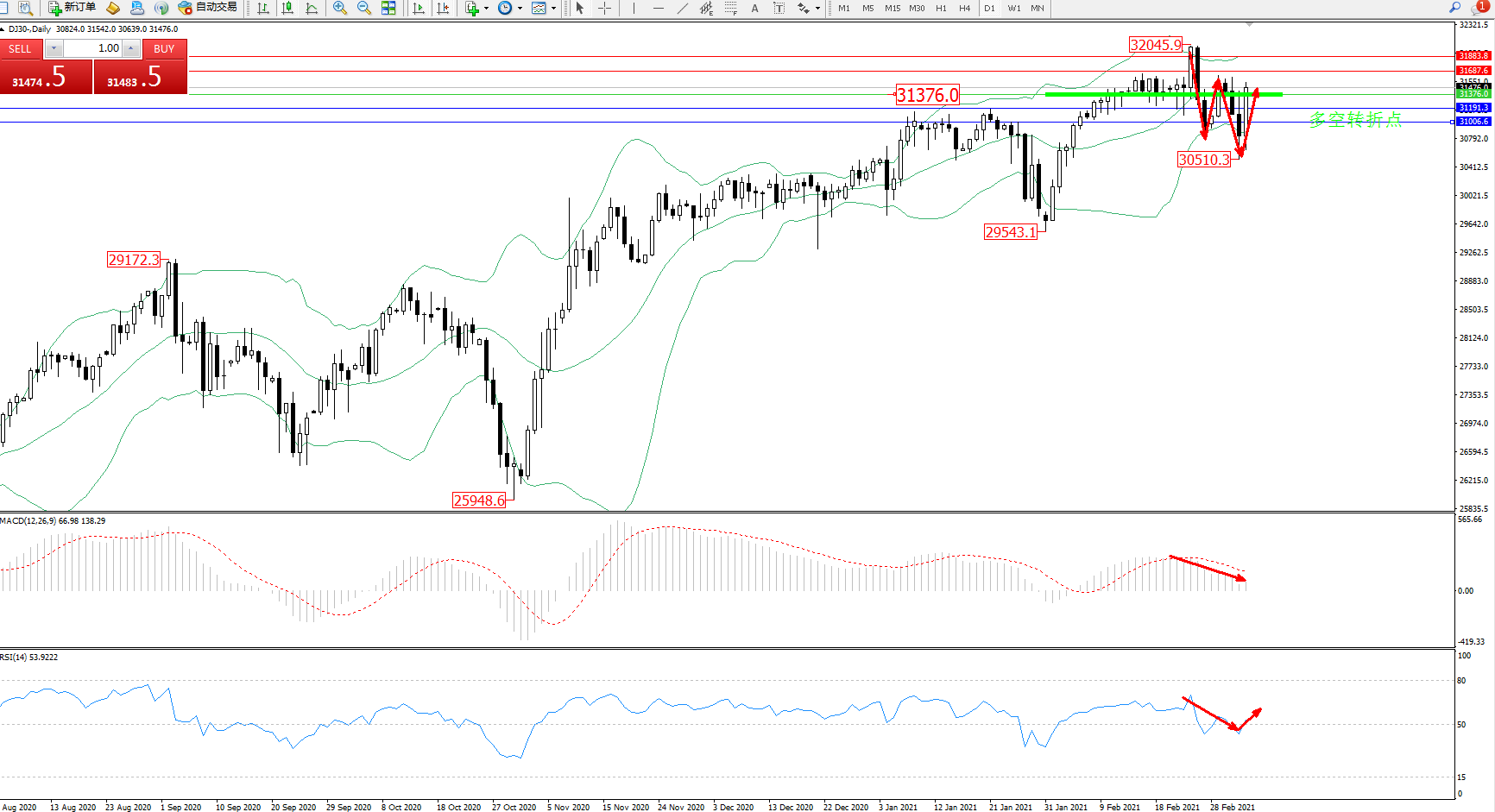 交易策略:31376上方看涨,目标31687、31883