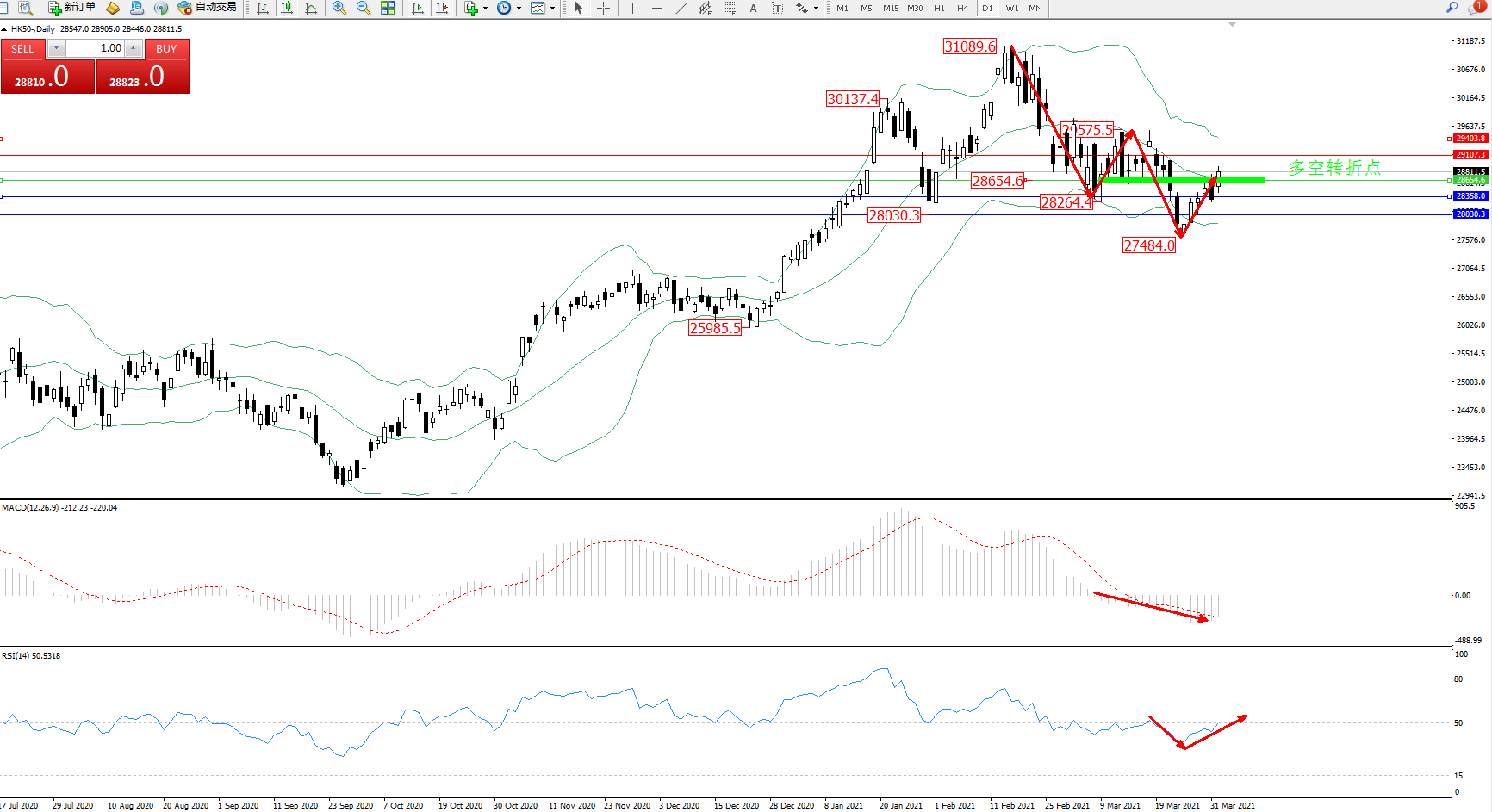 技术点评:空头动力延续布林带指标通道中下轨区间持续震荡向下移动,低位触及27484位置后开始反转上移,触及中轨附近维持震荡持续上行,布林带指标呈收口走势向下移动持续中,关注中下轨区间节点,MACD指标处于0轴线下方空头区域维持整理平移中,RSI指标处于50均衡线下方弱势徘徊中;