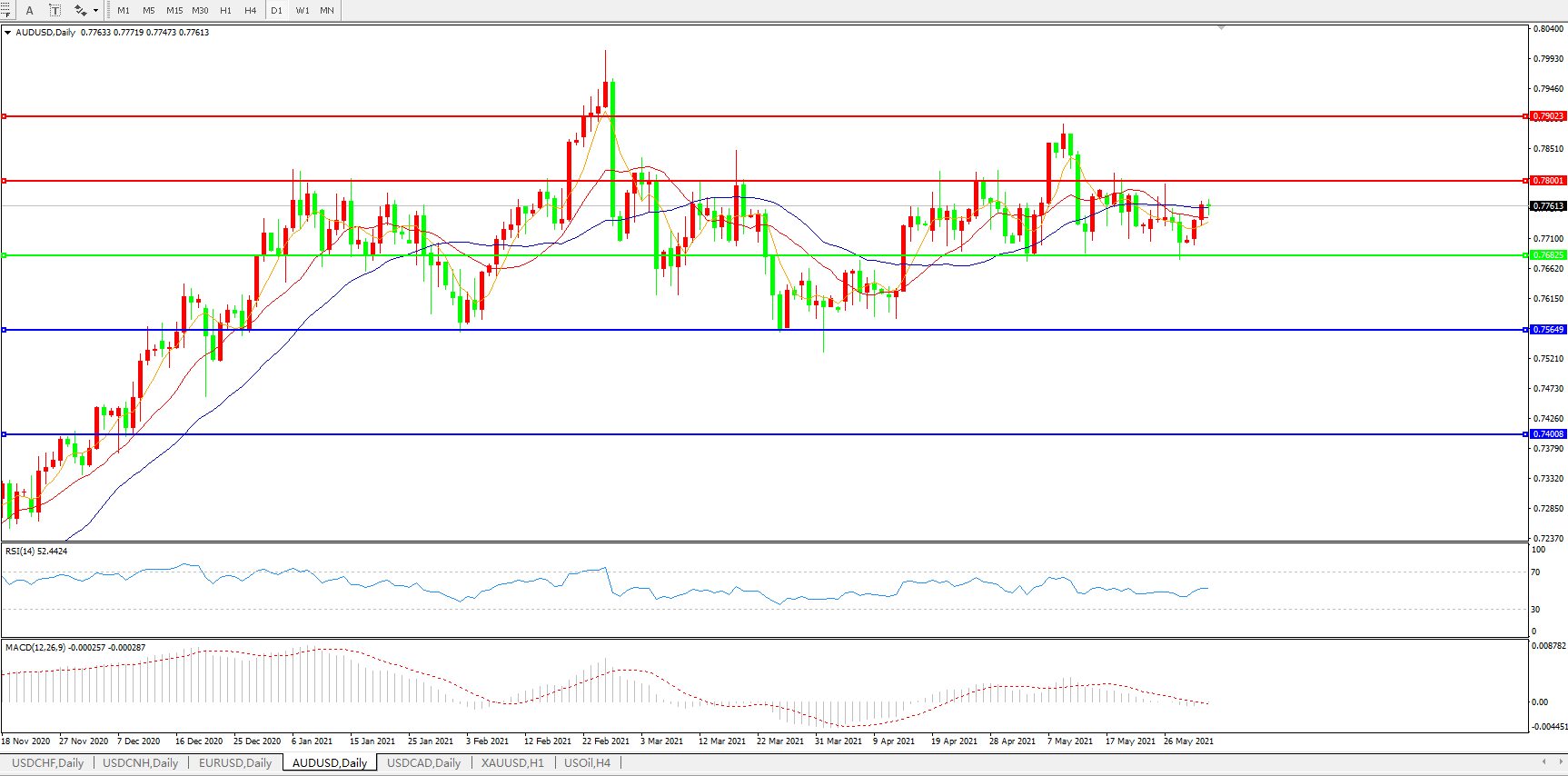 交易策略:0.7680上方看涨,目标0.7800、0.7900