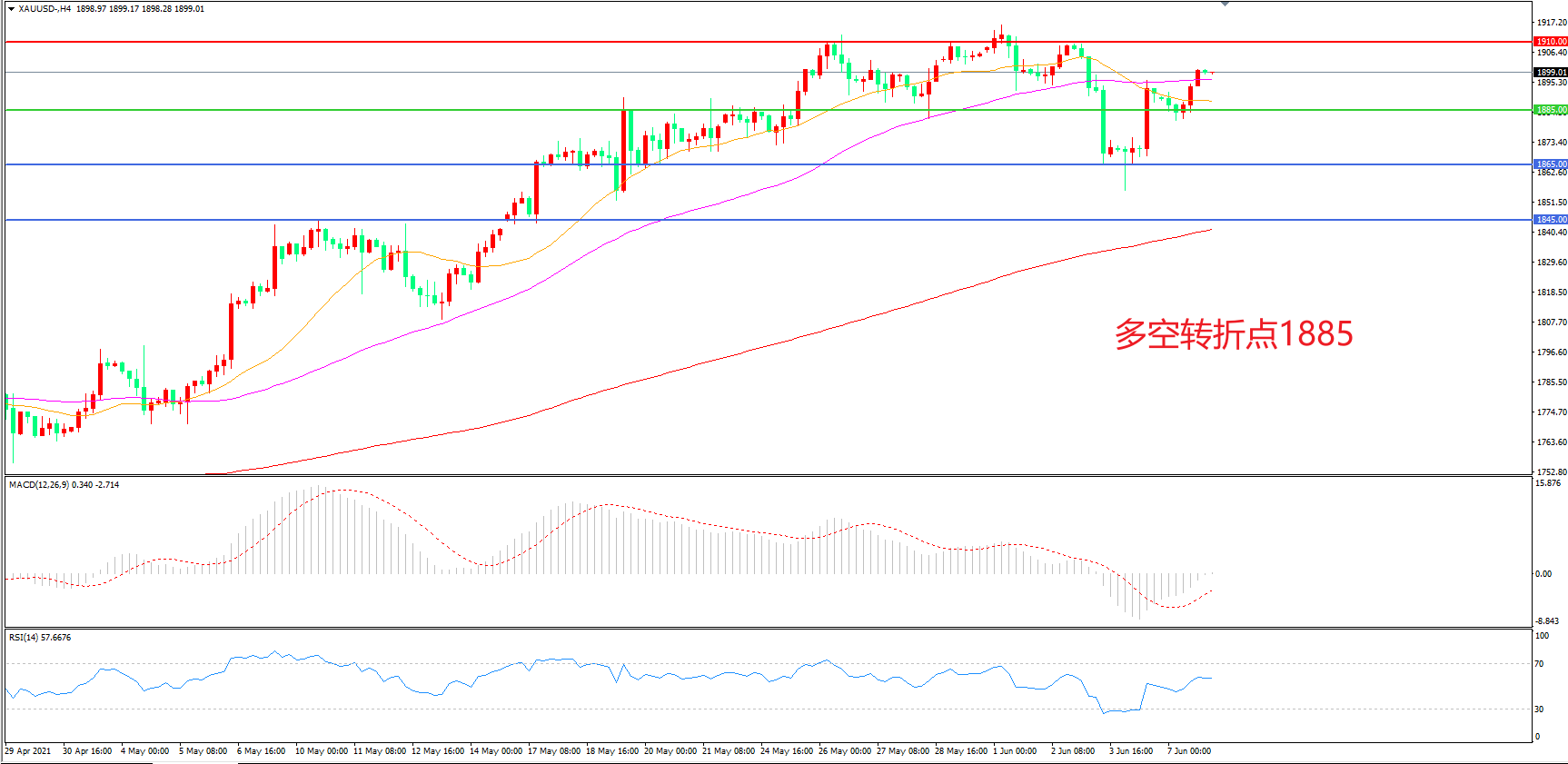 4小时图看,金价阳线连续拉升,短期表现偏强,1890成为多空分水岭,MACD绿柱缩短,RSI指标走平,日内延续上行概率较大。