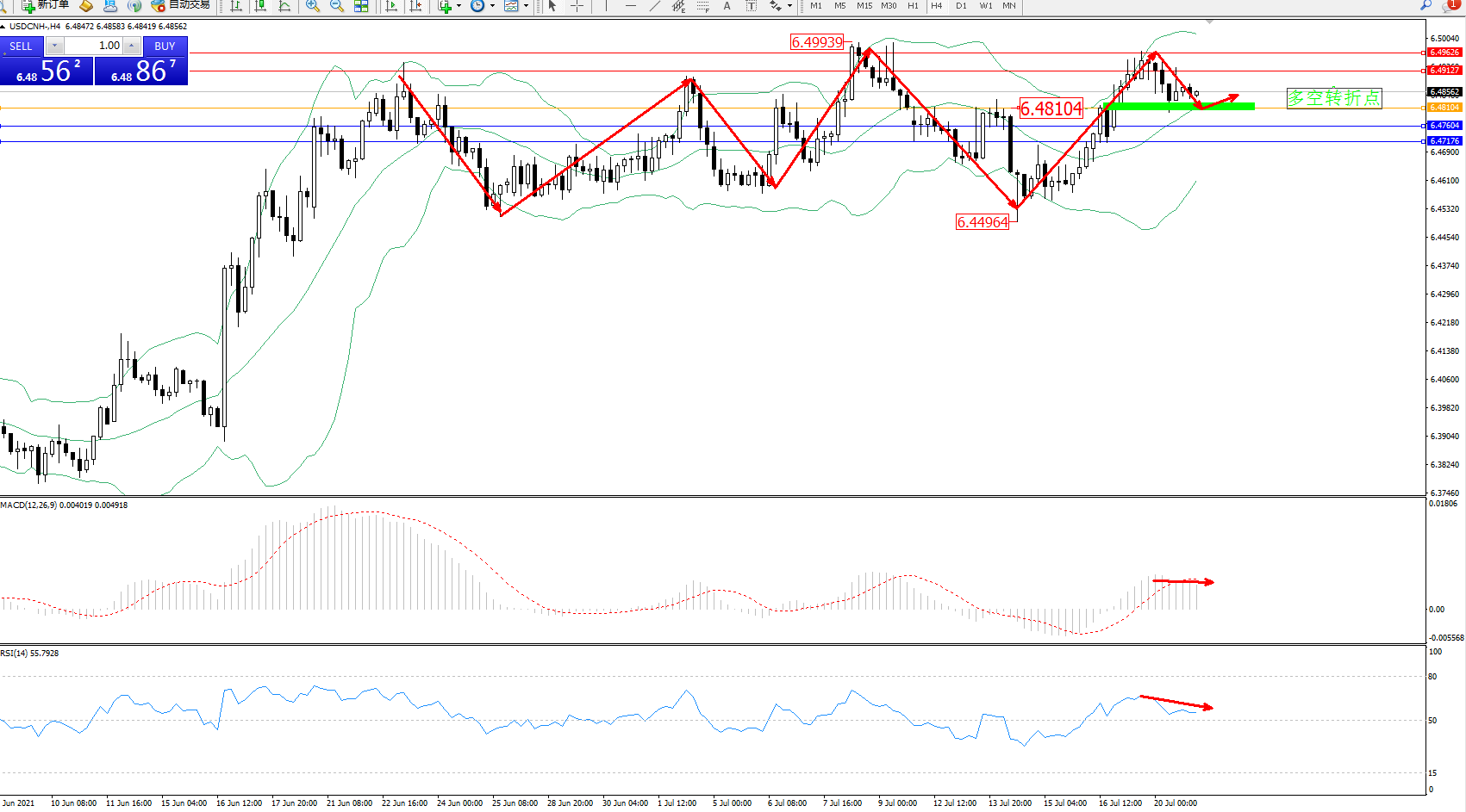 美元人民币USDCNH——4小时K线图显示: