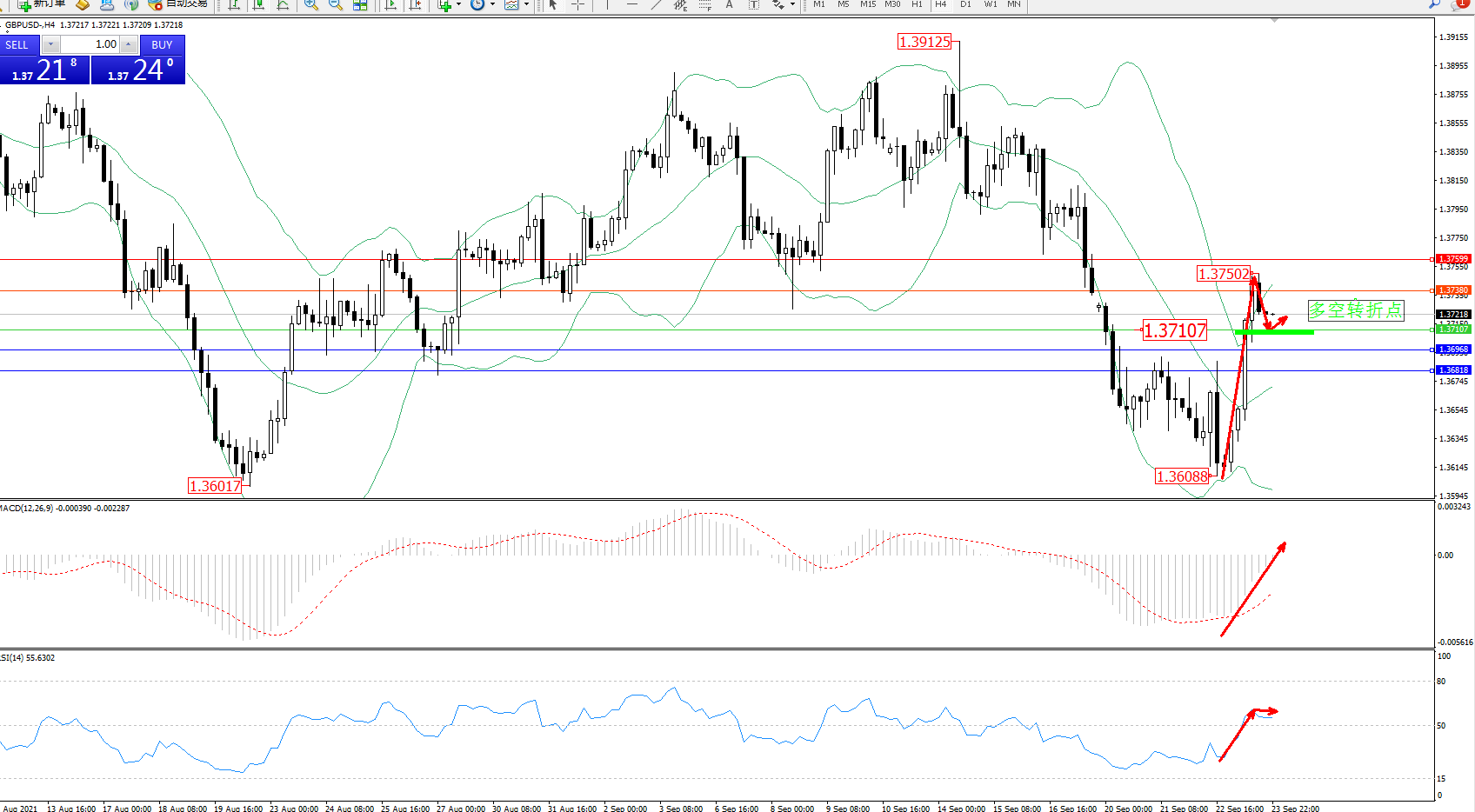 交易策略:1.37107上方看涨,目标1.37380、1.37599
