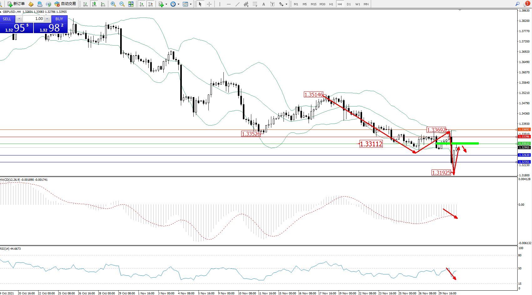 交易策略:1.33112下方看跌,目标1.32630、1.32351