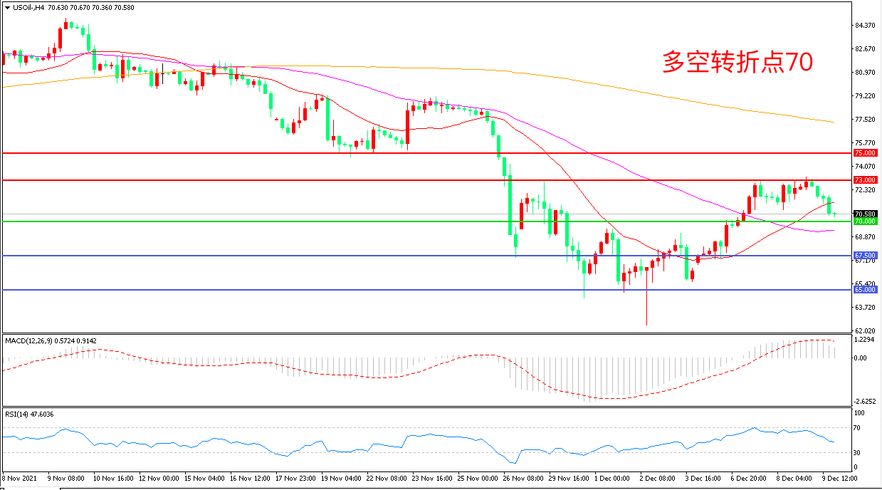 4小时图看,油价触碰73美元阻力后震荡回落,上行趋势暂缓,均线系统走平。70美元成为多空分水岭,MACD红柱缩短,RSI指标走平,日内延续震荡概率较大。