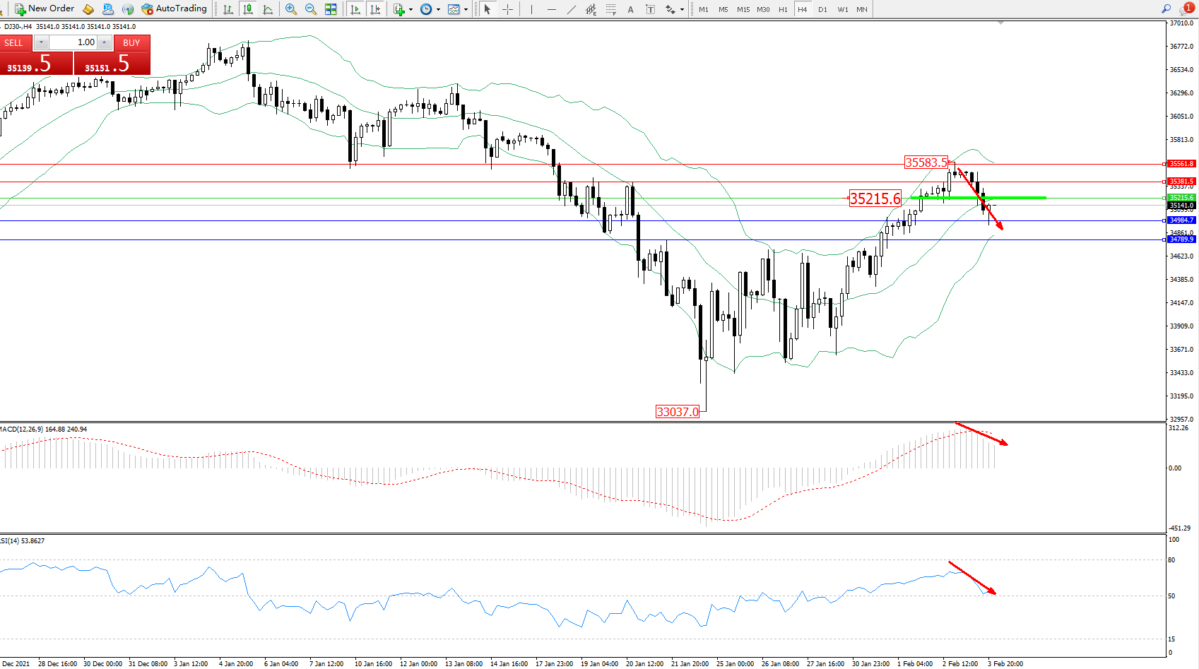 道琼斯指数DJ30——4小时K线图显示: