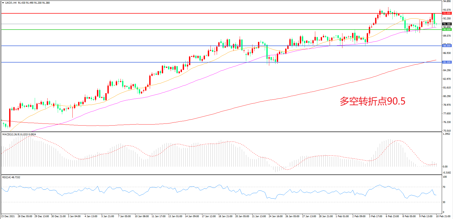 4小时图看,油价受阻于93美元后大幅回落,上行趋势暂缓, 90.5美元成为多空分水岭,MACD红柱增加,RSI指标走平,日内震荡上行概率较大。