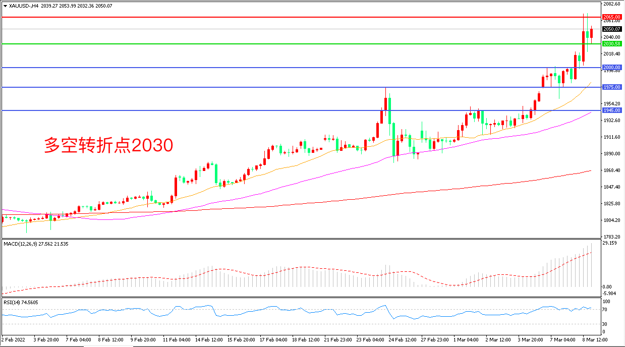 周二(3月8日),英国、美国禁止俄罗斯原油进口,西方对俄罗斯制裁扩大化加剧了市场情绪的恐慌,大量避险资金涌入黄金市场,现货黄金大幅飙升,收报2050.07美元/盎司。黄金价格目前处于超买状态,但没有出现动力枯竭的迹象,在全球地缘政治的不确定性上升的情形下,投资者、消费者和央行对黄金需求将大幅增加。
