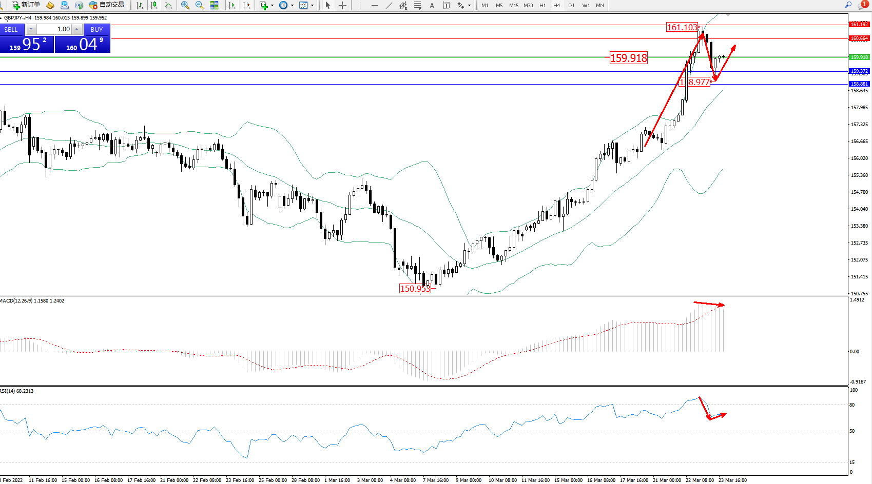 交易策略:159.918上方看涨,目标160.664、161.192