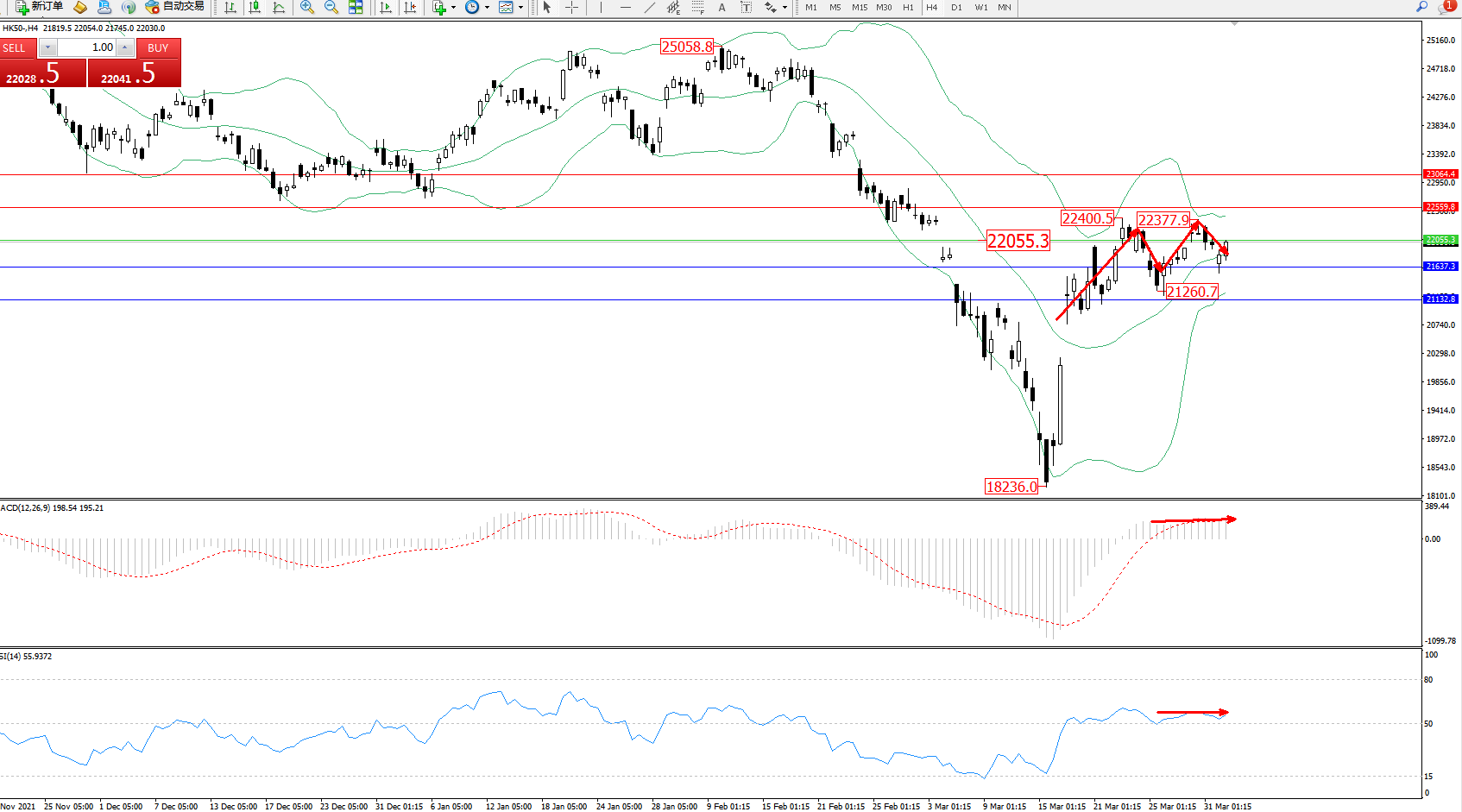 恒指HK50 ——4小时K线图显示: