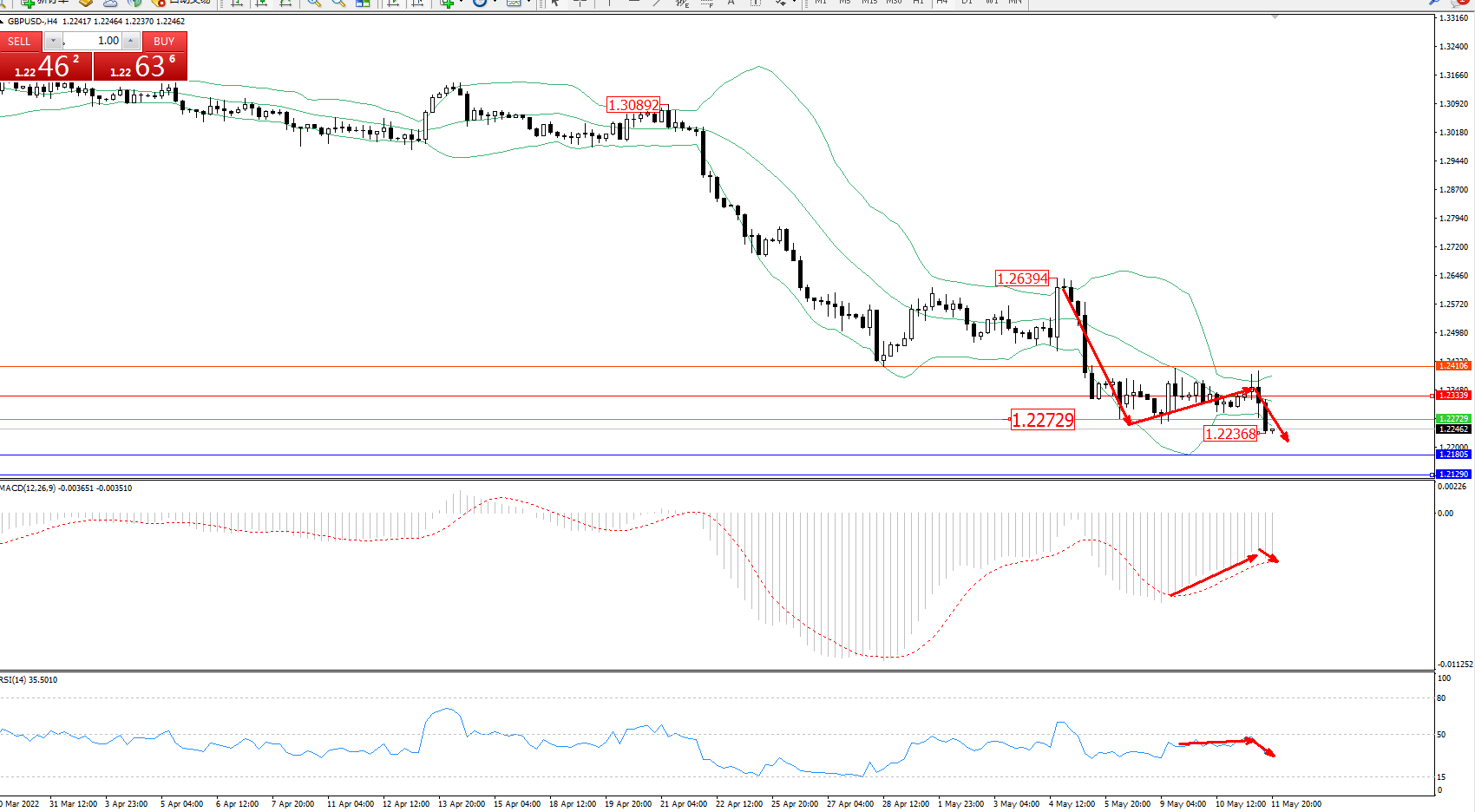 交易策略:1.22729下方看跌,目标1.21805、1.21290