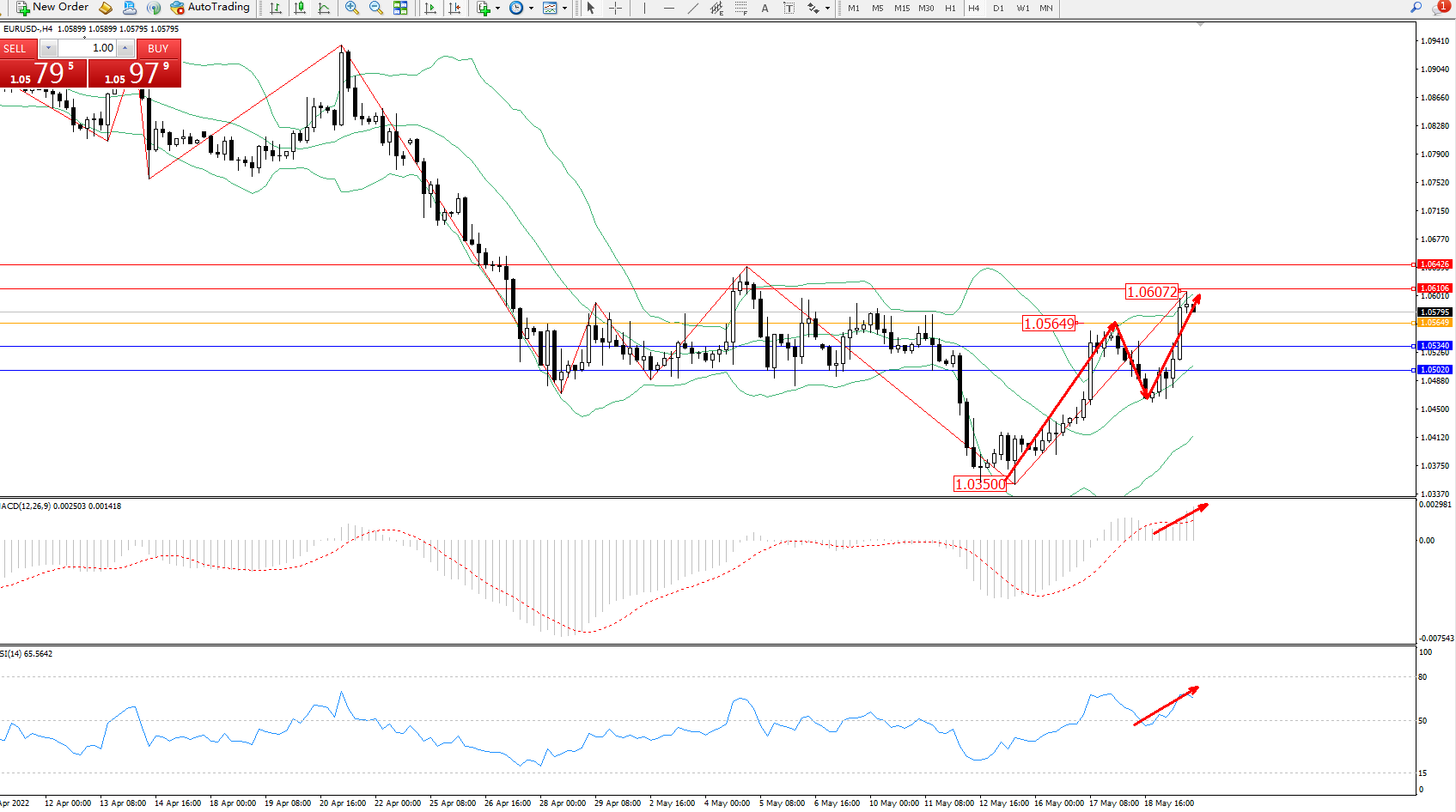 欧元兑美元维持1.05795附近震荡, 受能源和食品价格大幅上涨影响,今年4月欧元区通胀率按年率计算达7.4%,低于此前的初步预估7.5%;核心CPI月率为1.2%,与预期一致。低于预期的通胀率数据似乎降低了欧央行迫切加息的欲求。