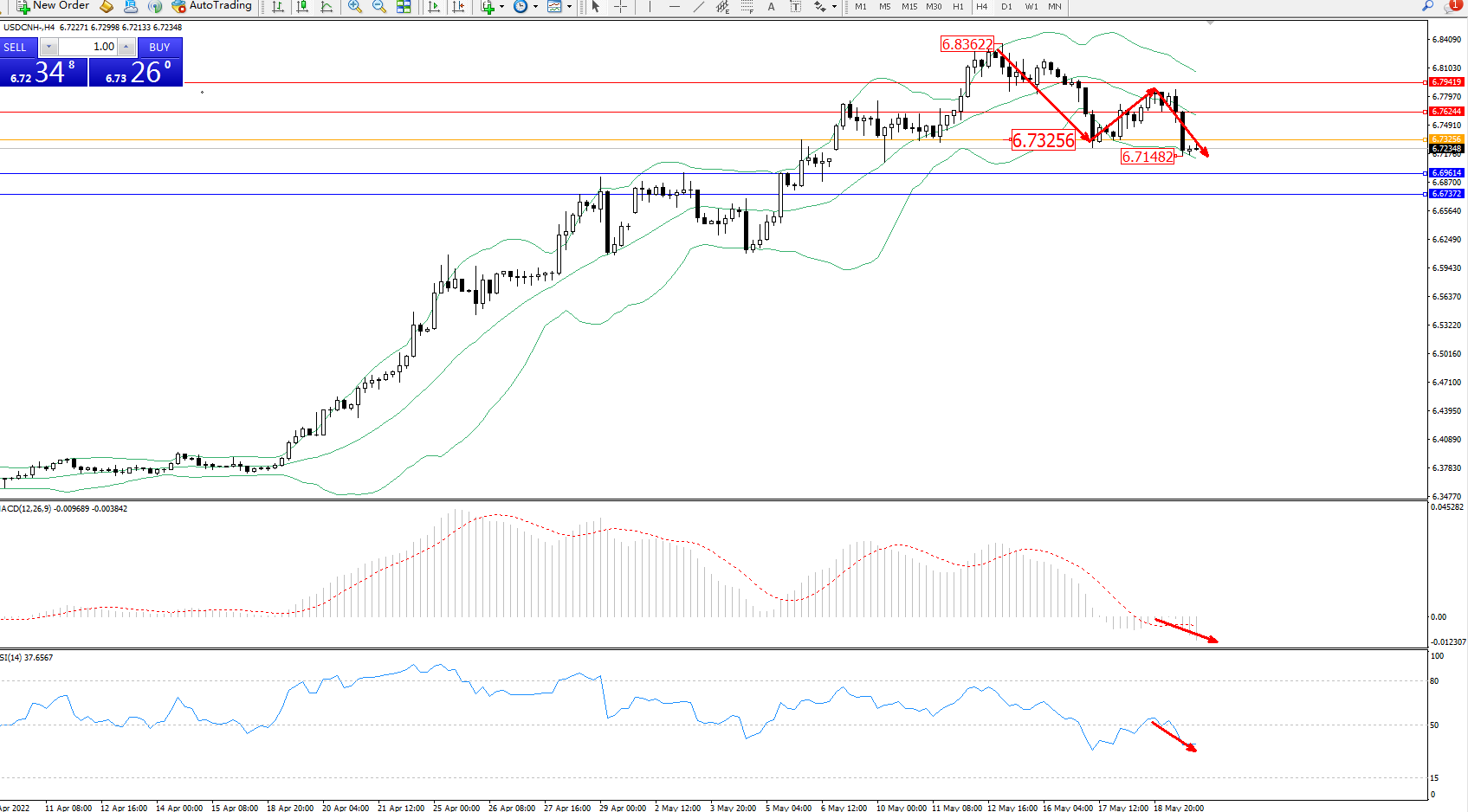 美元人民币USDCNH——4小时K线图显示: