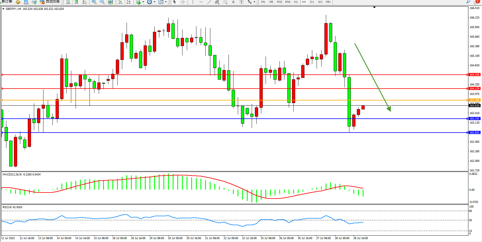 交易策略:163.788下方看跌,目标163.242、162.833