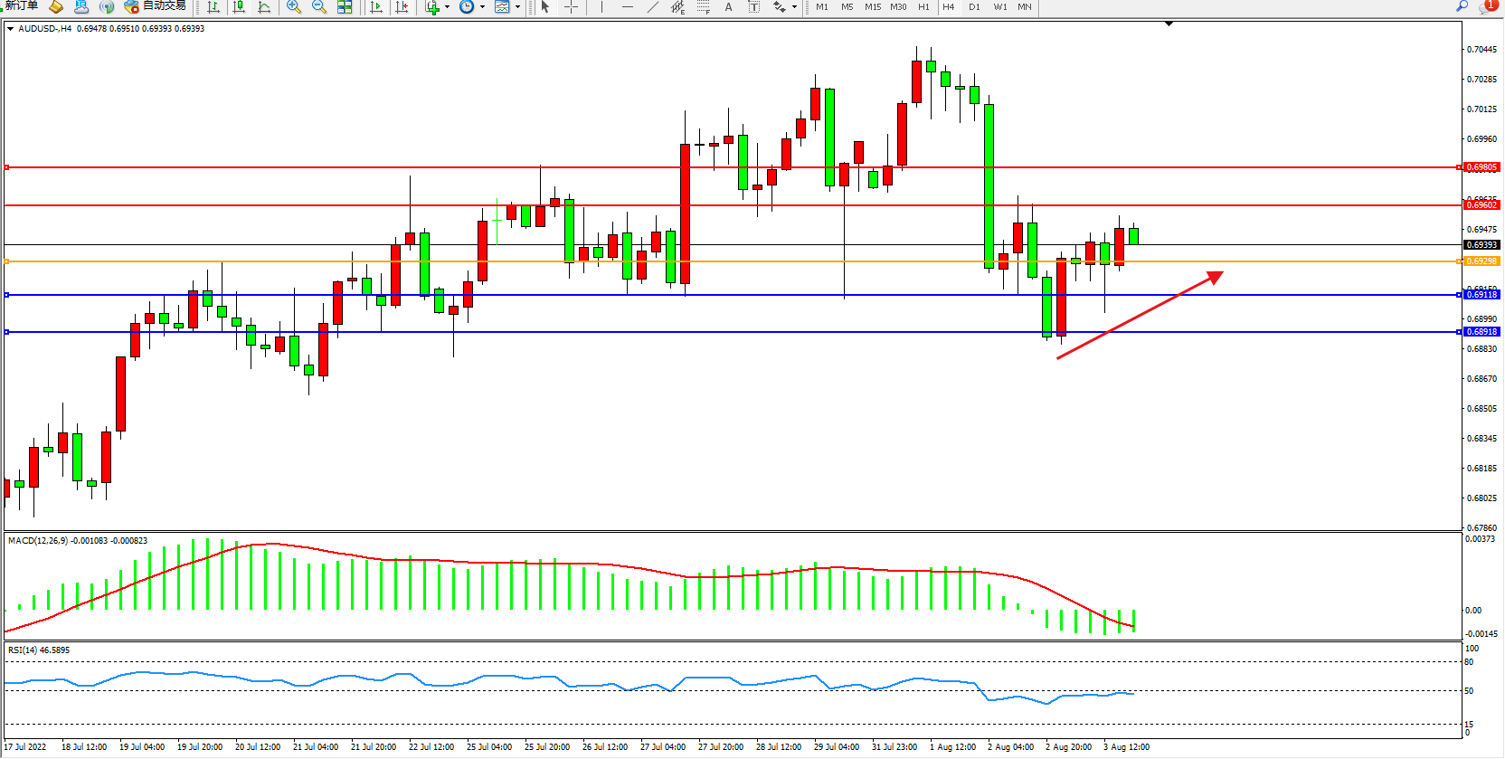 交易策略:0.69298上方看涨,目标0.69602、0.69805