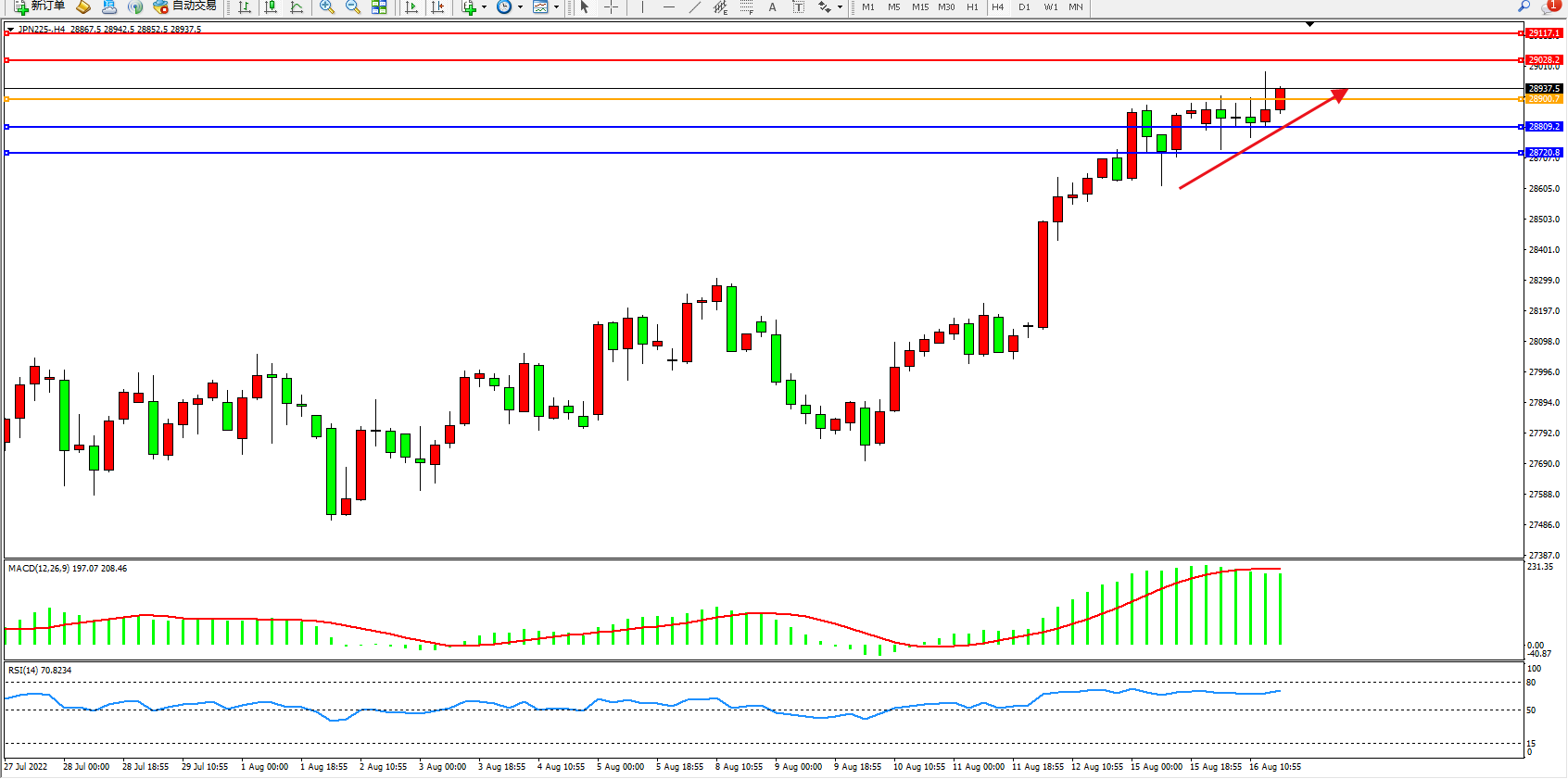 日经指数JPN225——4小时K线图显示: