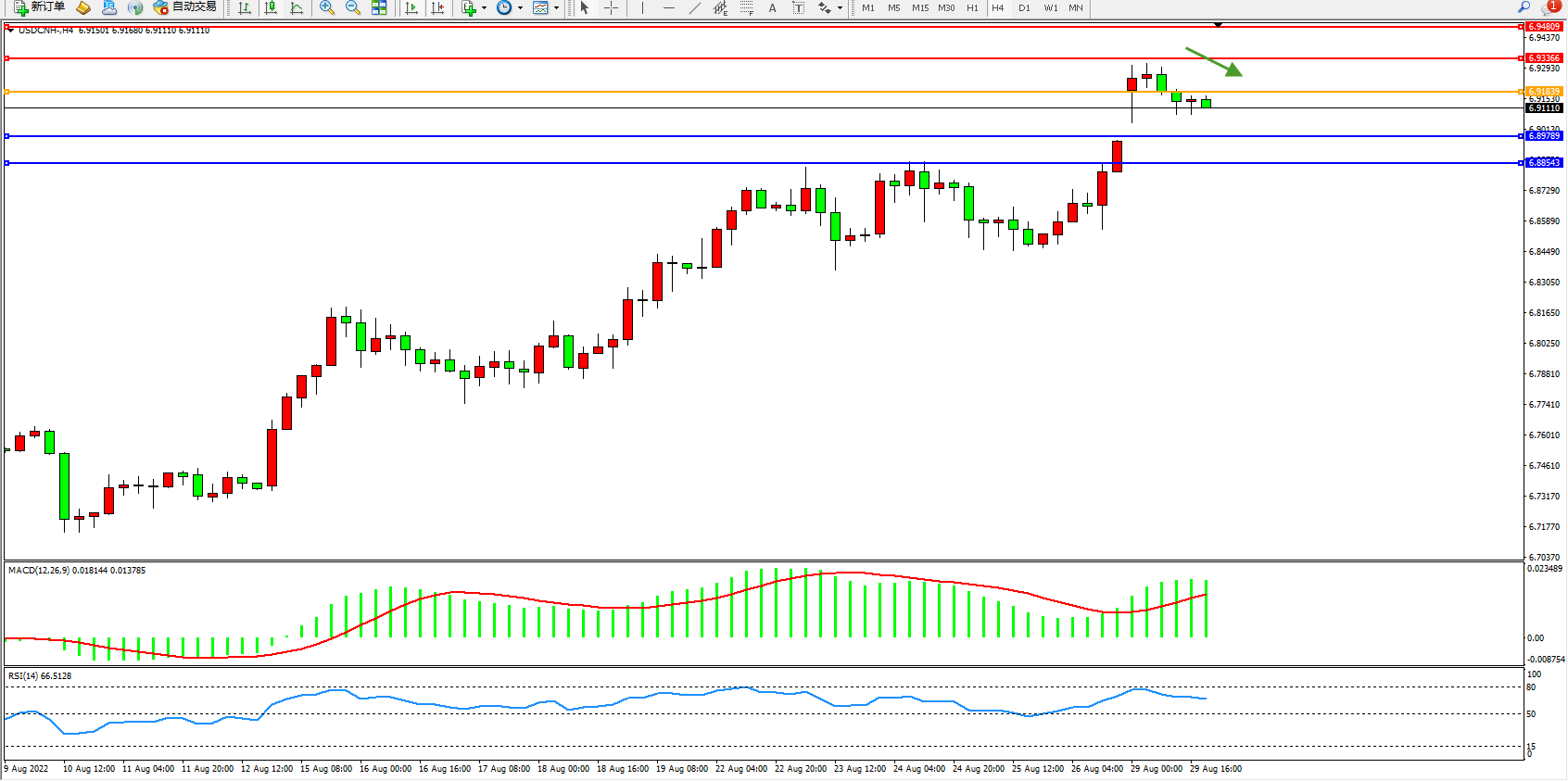 美元人民币USDCNH——4小时K线图显示: