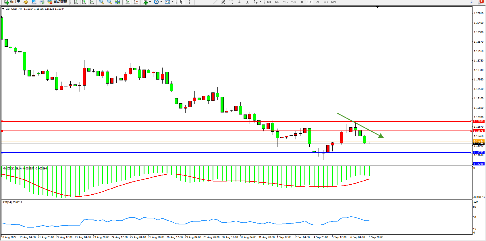 交易策略:1.15232下方看跌,目标1.14727、1.14230