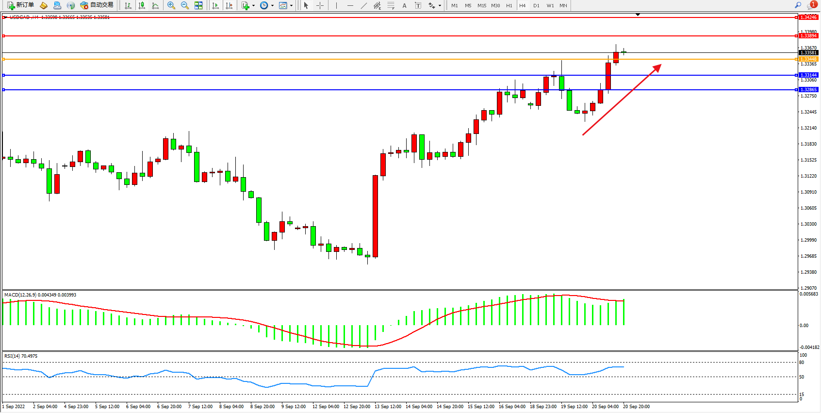 美元加元USDCAD——4小时K线图显示: