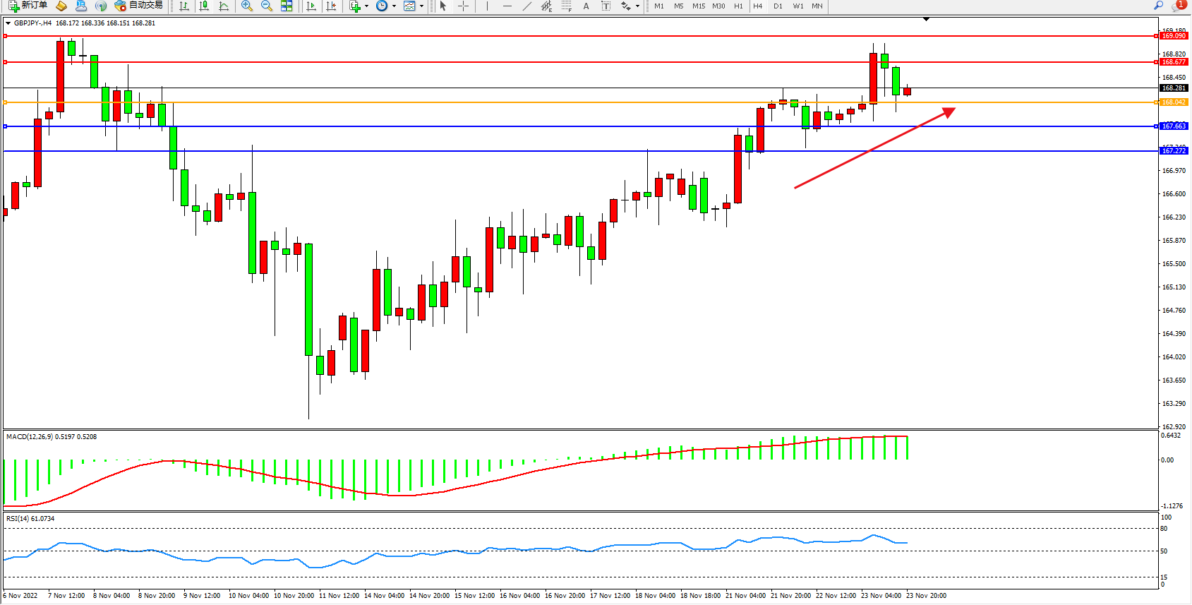 交易策略:168.042上方看涨,目标168.677、169.090