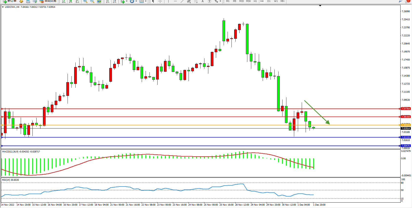 交易策略:7.04555下方看跌,目标7.02155、7.00476
