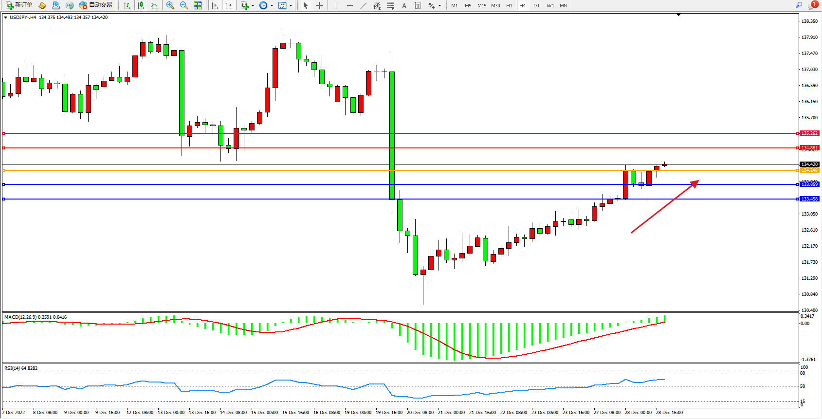 交易策略:134.246上方看涨,目标134.861、135.262