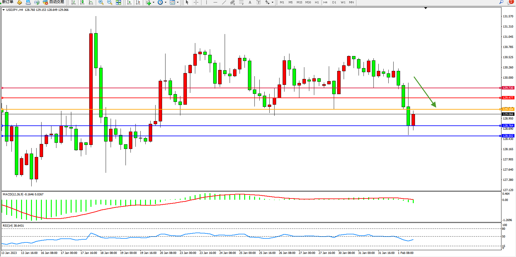 交易策略:129.184下方看跌,目标128.764、128.502