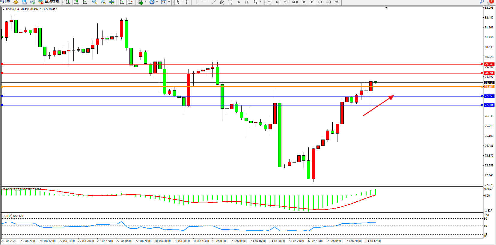 交易策略:78.154上方看涨,目标78.991、79.549