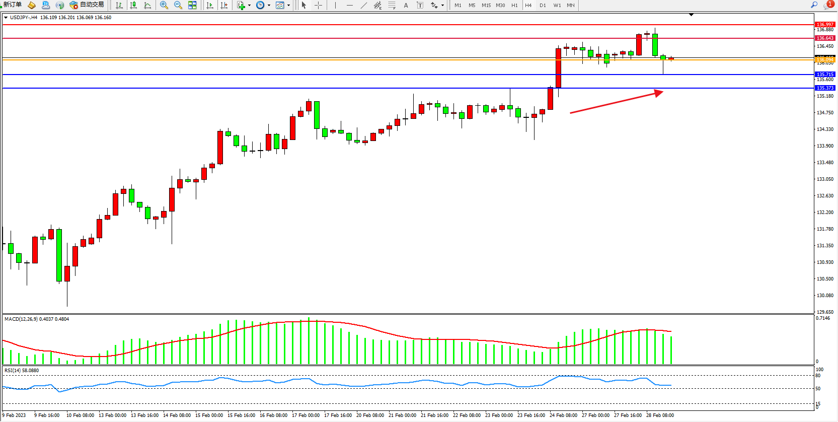 交易策略:136.094上方看涨,目标136.643、136.997