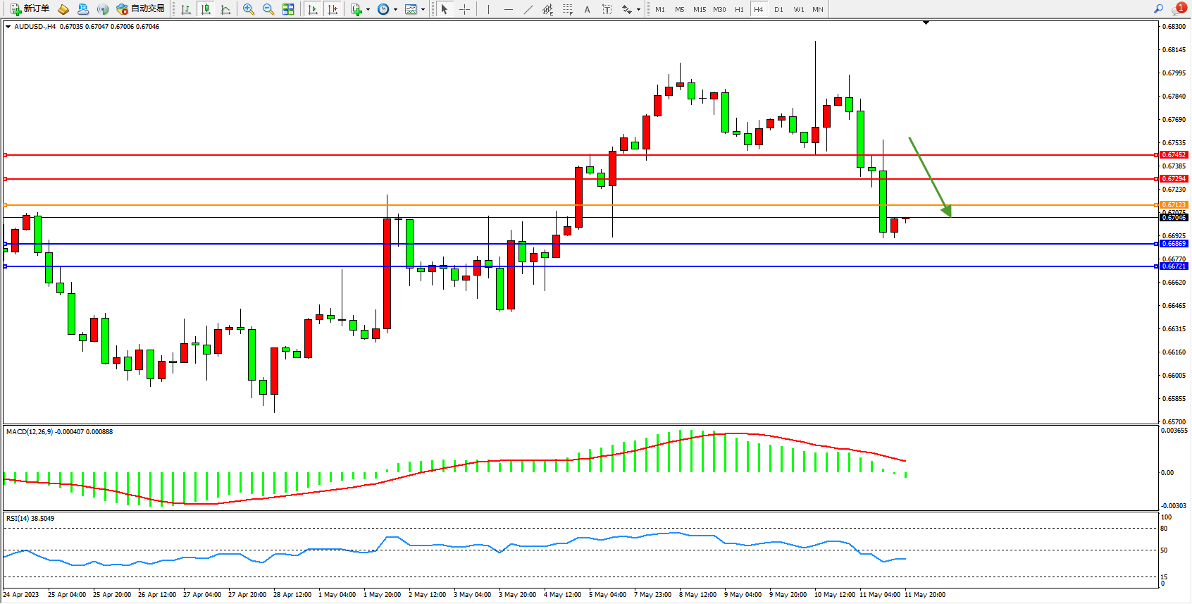 交易策略:0.67123下方看跌,目标0.66869  0.66721