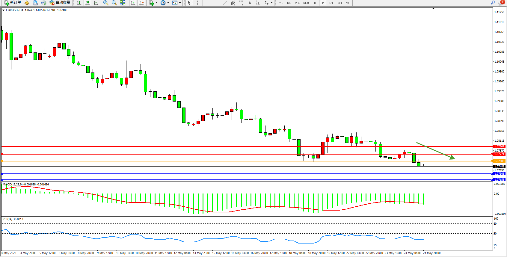 欧元美元EURUSD—4小时K线图显示: