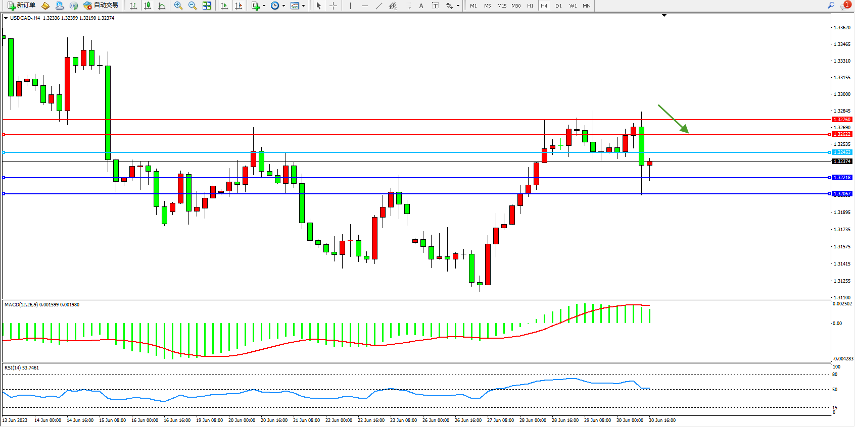 美元加元USDCAD——4小时K线图显示: