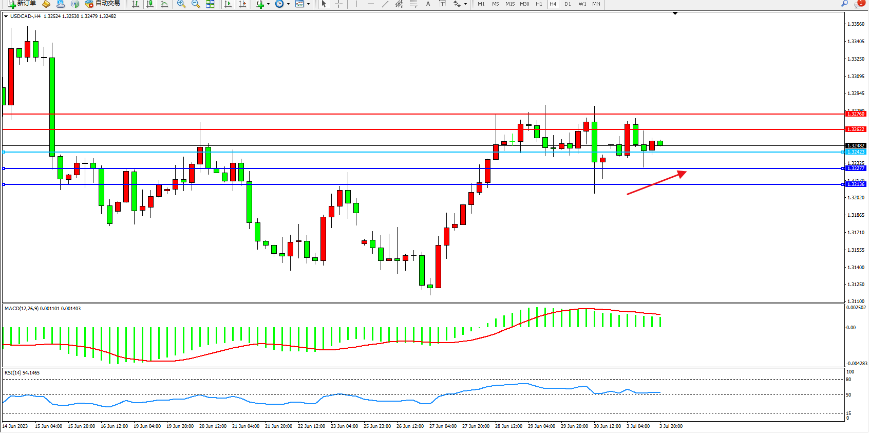 美元加元USDCAD——4小时K线图显示:
